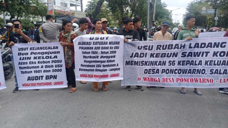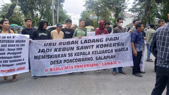 Medan | inidetik.com Puluhan warga Desa Poncowarno menggelar aksi unjuk rasa, mendesak Rektor USU, Prof. Muryanto Amin, untuk bersikap jujur dan segera menyelesaikan masalah ganti rugi lahan yang sudah berlangsung selama selama 39 tahun.