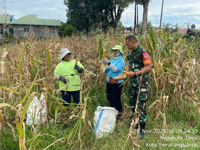 Kegiatan tersebut berlangsung di lahan pertanian milik Ibu Br. Sihotang, yang berlokasi di Kelurahan Nagahuta Timur, Kota Pematangsiantar. Dengan penuh semangat, Kopda J. Manik turut turun ke ladang, memetik jagung bersama pemilik lahan dan warga sekitar.
