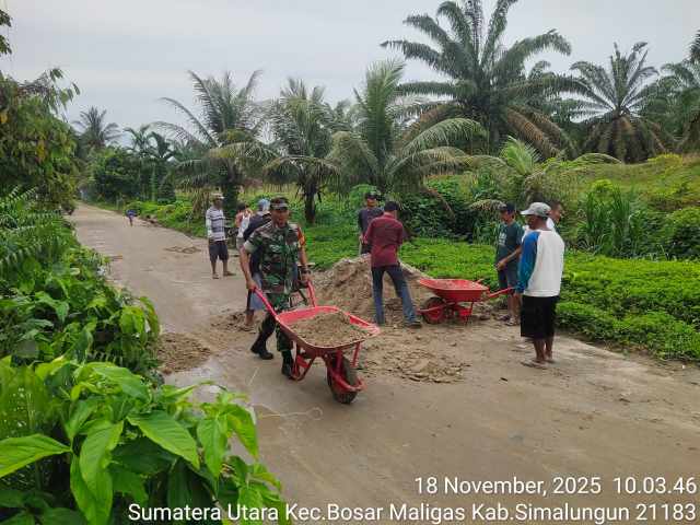 Simalungun | inidetik.com Semangat kebersamaan kembali terlihat di Nagori Sei Torop, Kecamatan Bosar Maligas, Kabupaten Simalungun. Pada Selasa, 18 November 2025, Babinsa Koramil 07/Bosar Maligas Kodim 0207/Simalungun, Serka Parno, turun langsung ke lapangan bergotong royong bersama warga memperbaiki jalan rusak dan berlubang yang selama ini menghambat aktivitas masyarakat.