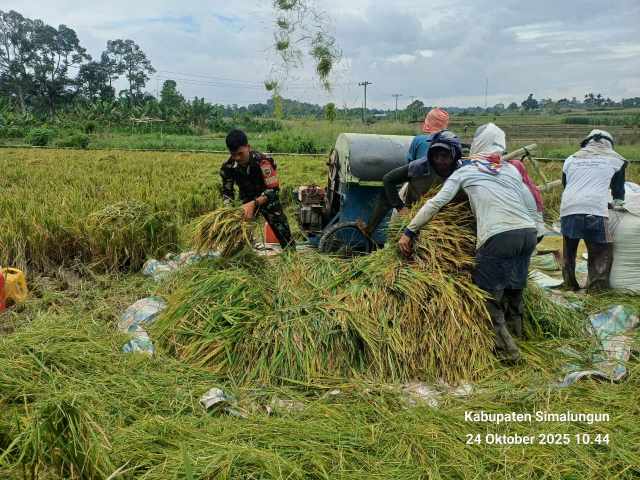Simalungun I inidetik.com Dalam upaya mendukung ketahanan pangan di wilayah binaannya, Babinsa Koramil 09/Tiga Balata, Kodim 0207/Simalungun, Serda P. Simatupang melaksanakan pendampingan panen padi milik warga binaannya, Bapak Natal Simajuntak, di Dusun I Pasar Baru, Nagori Dolok Tomuan, Kecamatan Dolok Panribuan, pada Jumat (24/10/2025).