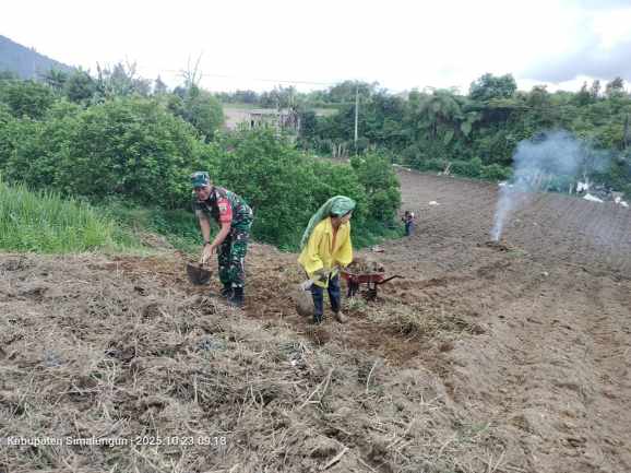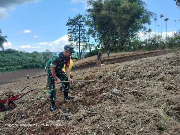 Simalungun I inidetik.com Kepedulian terhadap masyarakat di wilayah binaan kembali ditunjukkan oleh Babinsa Koramil 12/Saribu Dolok, Kodim 0207/Simalungun. Kali ini, Kopda E.S. Sijabat turun langsung membantu warga dalam kegiatan pengolahan lahan pertanian di Nagori Ujung Saribu, Kecamatan Pamatang Silimakhuta, pada Kamis (23/10/2025).