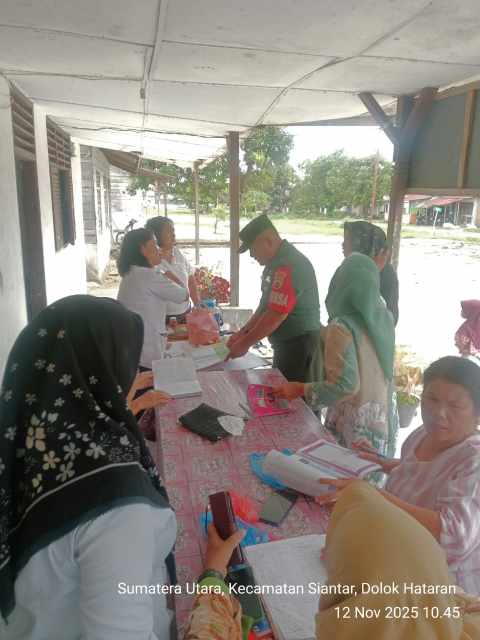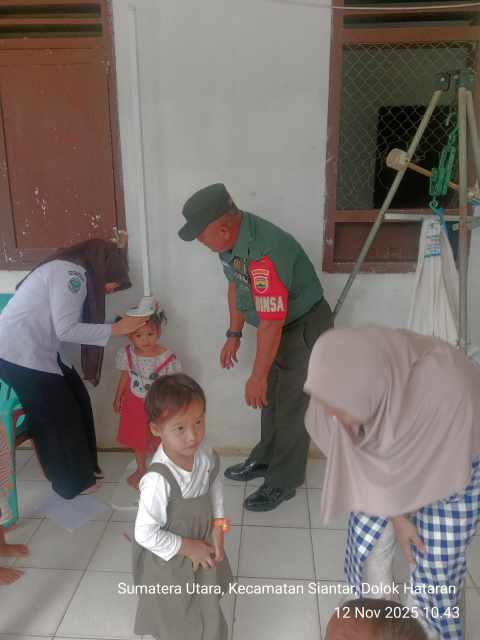Simalungun | inidetik.com Dalam upaya mendukung peningkatan kesehatan masyarakat di wilayah binaannya, Babinsa Koramil 10/Tanah Jawa Kodim 0207/Simalungun, Serka Frans R. Tampubolon, turut serta memantau kegiatan Posyandu yang dilaksanakan di Puskesmas Pembantu (Pustu) Huta Raya Timuran, Nagori Mariah Jambi, Kecamatan Jawa Maraja Bah Jambi, Kabupaten Simalungun, pada Rabu (12/11/2025).