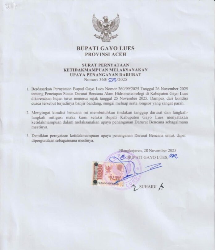 Blangkejeren | inidetik.com Pemerintah Kabupaten Gayo Lues secara resmi menyatakan ketidakmampuan dalam melaksanakan upaya penanganan darurat bencana akibat bencana alam hidrometeorologi yang melanda wilayah tersebut sejak 25 November 2025.