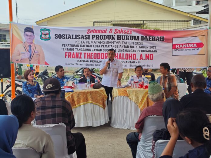 Pematangsiantar I inidetik.com Anggota DPRD Kota Pematangsiantar, Franz Theodore Sihaloho, A.Md dari Komisi I, menggelar kegiatan Sosialisasi Peraturan Daerah (Sosper) di Lapangan Santiago, Jalan Siatas Barita, Kelurahan Tomuan, Kecamatan Siantar Timur, Jumat (17/10/2025).