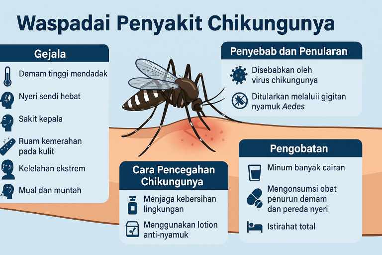 inidetik.com I Chikungunya adalah infeksi yang disebabkan oleh virus Chikungunya dan ditularkan melalui gigitan nyamuk Aedes, seperti Aedes aegypti dan Aedes albopictus. Penderitanya umumnya mengalami demam tinggi, nyeri sendi yang bisa terasa sangat hebat, sakit kepala, ruam kulit, serta kelelahan.