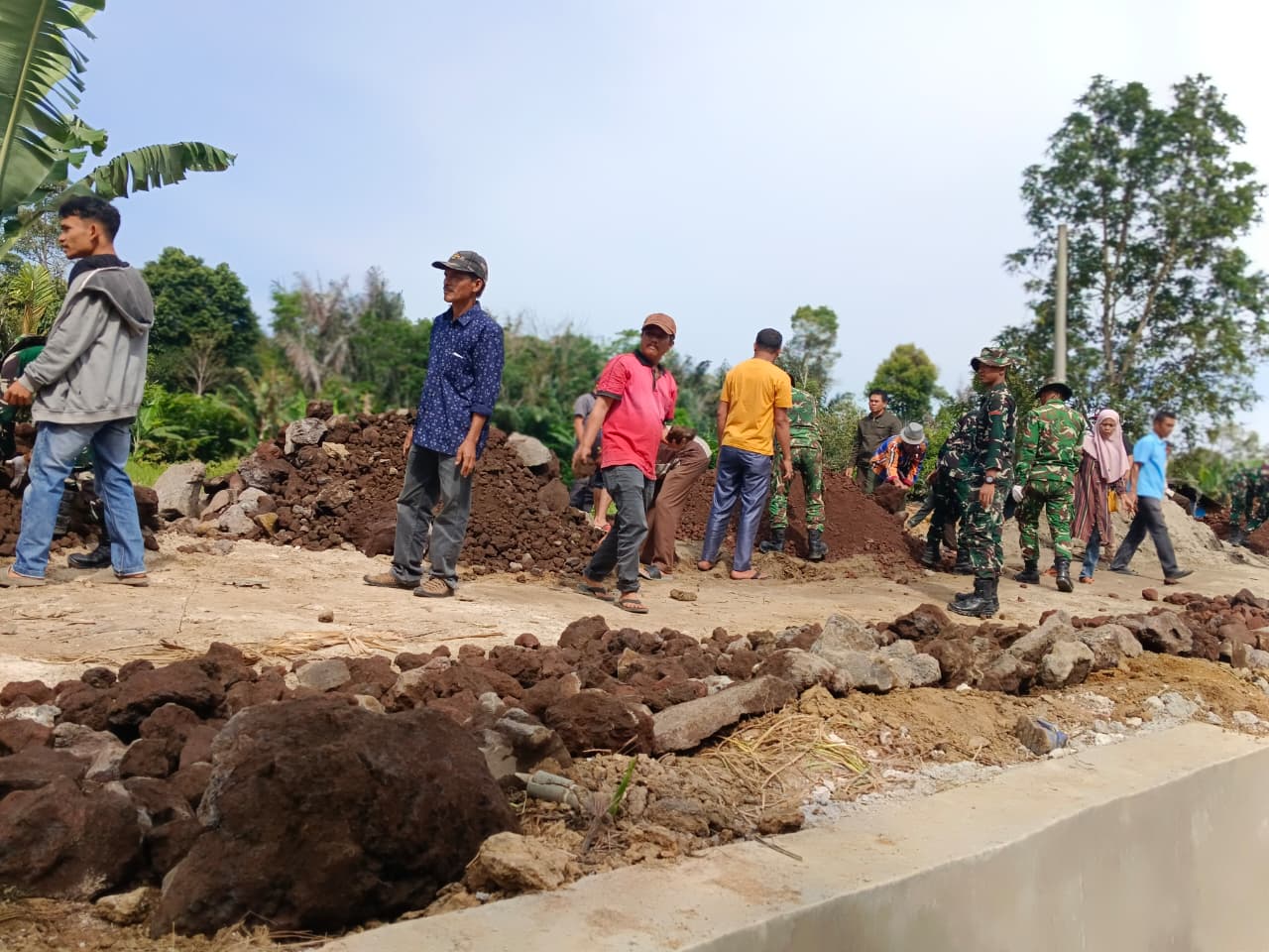 Tanpa menghiraukan panas yang menyengat, para prajurit TNI bersama masyarakat bahu-membahu menyusun batu demi mempercepat pembangunan infrastruktur jalan desa. Kegiatan ini menjadi bukti nyata kemanunggalan TNI dengan rakyat, di mana kebersamaan dan gotong royong menjadi kekuatan utama dalam mewujudkan pembangunan yang bermanfaat bagi masyarakat.