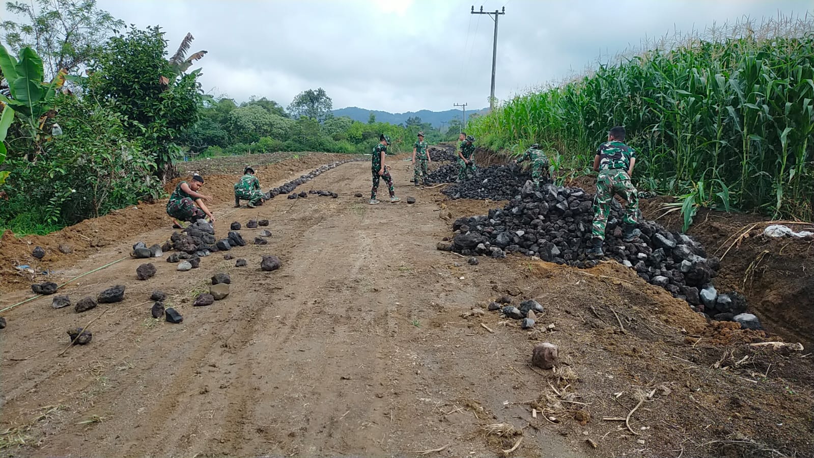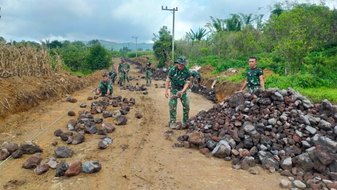 Sejak pagi hari, personel Satgas bersama masyarakat tampak kompak menyusun batu di sisi badan jalan. Pemasangan ini bertujuan untuk memperkuat struktur jalan agar lebih tahan terhadap longsor dan gerusan air, terutama saat musim hujan.