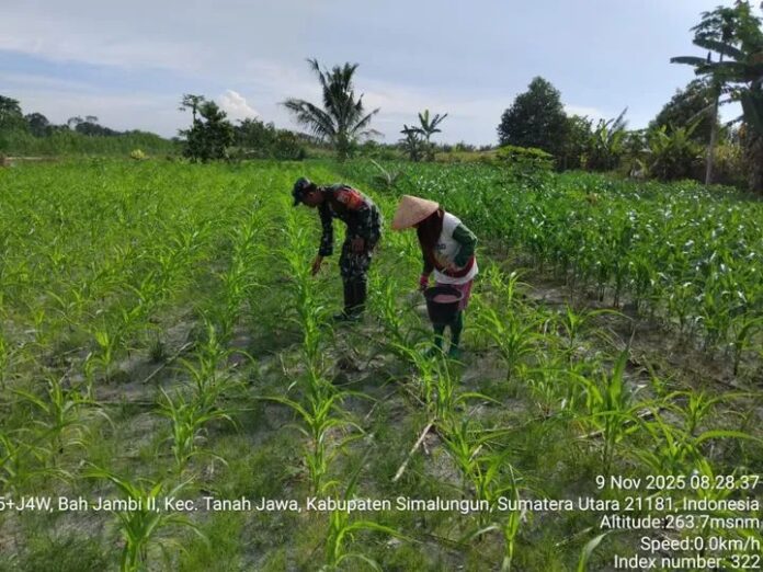 Dalam kegiatan tersebut, Serda H. Purba turut membantu Ibu Sri Murni, salah satu petani setempat, melakukan pemupukan tanaman jagung serta memantau perkembangan pertumbuhannya. Kegiatan ini tidak hanya menjadi wujud pendampingan Babinsa kepada petani, tetapi juga bentuk nyata kepedulian TNI terhadap sektor pertanian di wilayah binaan.