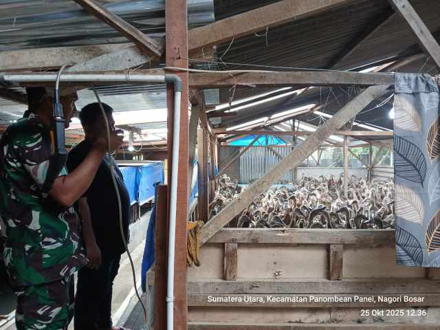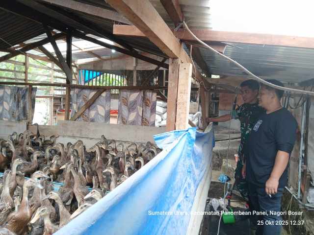 Simalungun I inidetik.com Dalam upaya mempererat kemanunggalan TNI dengan rakyat sekaligus mendukung pengembangan ekonomi desa, Babinsa Koramil 16/Panetongah Kodim 0207/Simalungun Serda J. Aritonang melaksanakan kegiatan Komunikasi Sosial (Komsos) di peternakan bebek dan lele milik Badan Usaha Milik Nagori (BUMNag), Nagori Bosar, Kecamatan Panombeian, Kabupaten Simalungun, Sabtu (25/10/2025).