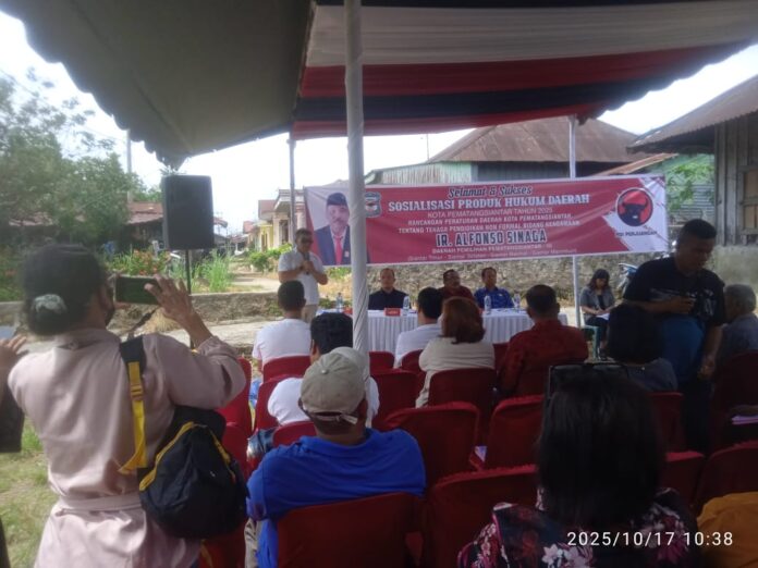 Pematangsiantar, inidetik.com – Anggota DPRD Kota Pematangsiantar dari Fraksi Partai Demokrasi Indonesia Perjuangan (PDIP), Ir. Alvonso Sinaga, menggelar Sosialisasi Peraturan Daerah (Sosper) di Jalan Seribudolok, Kelurahan Naga Huta, Kecamatan Simarimbun, Jumat (17/10/2025) sekitar pukul 10.00 WIB.